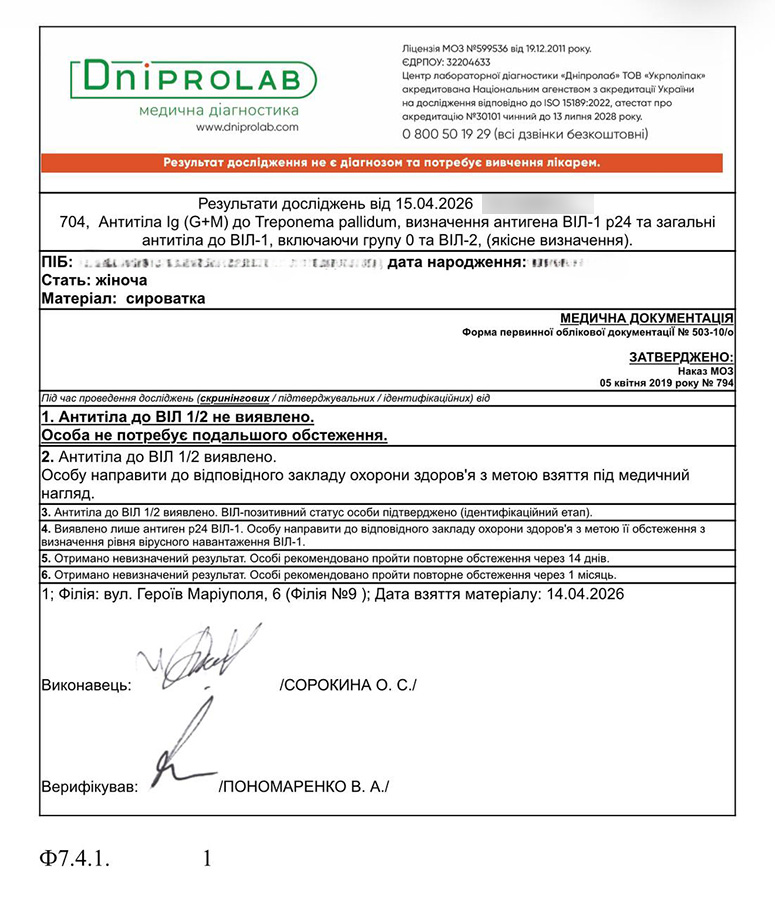 Translation: HIV, hepatitis, syphilis negative (15.04.2026)